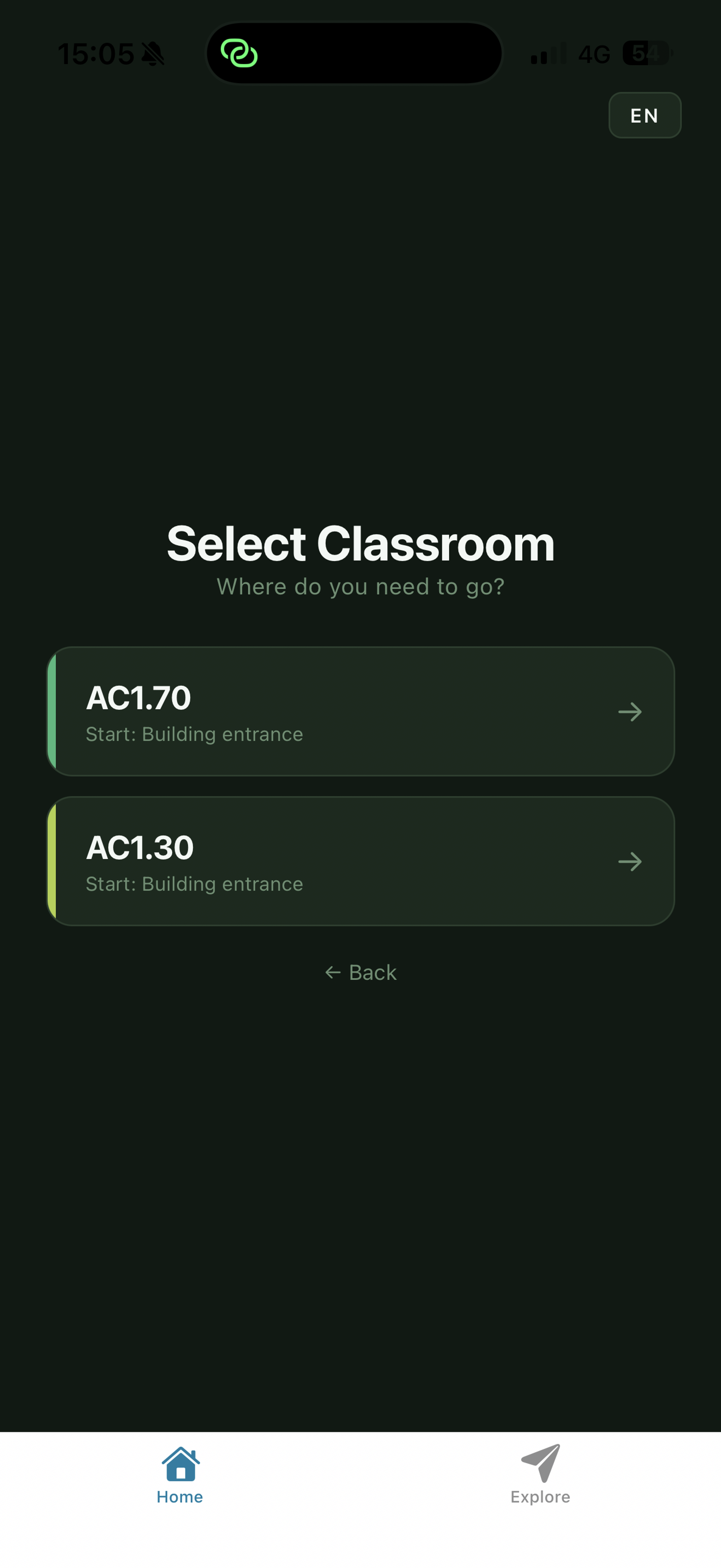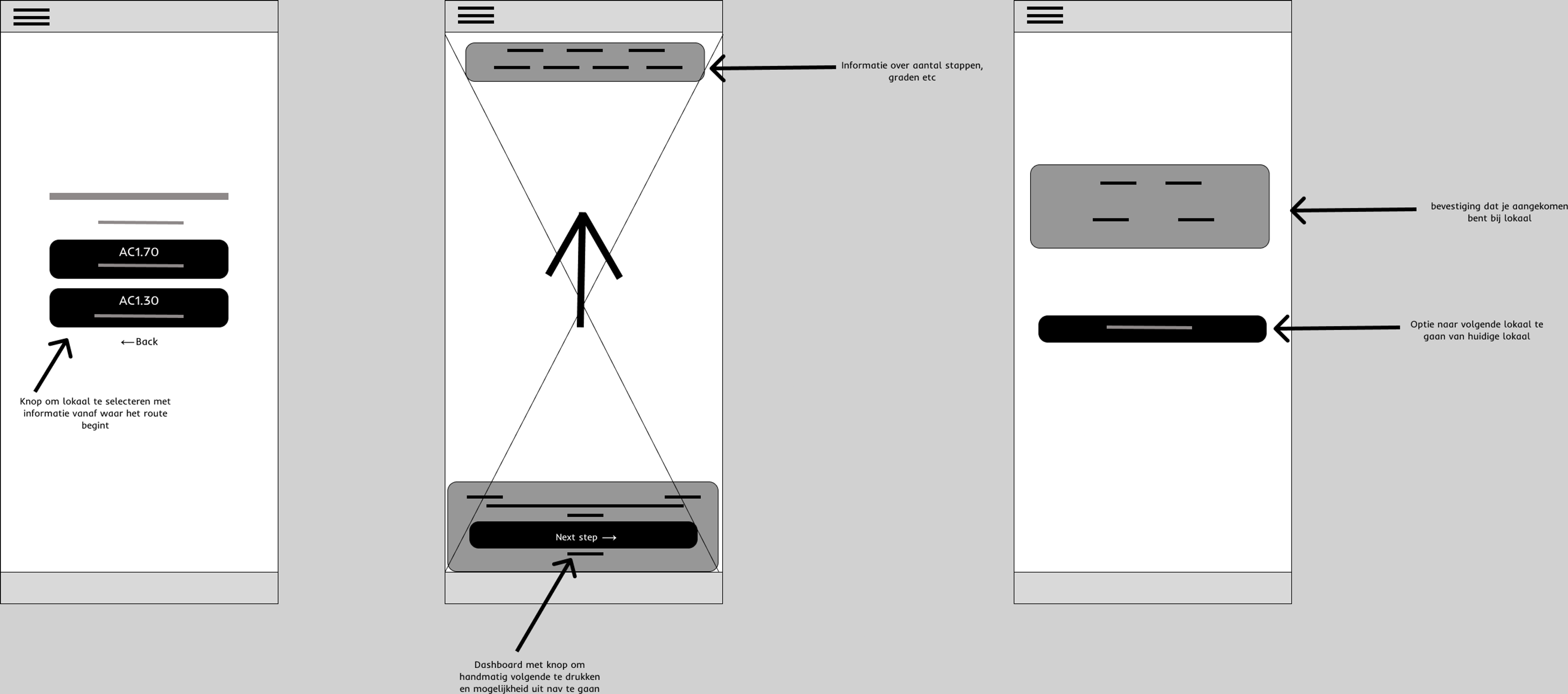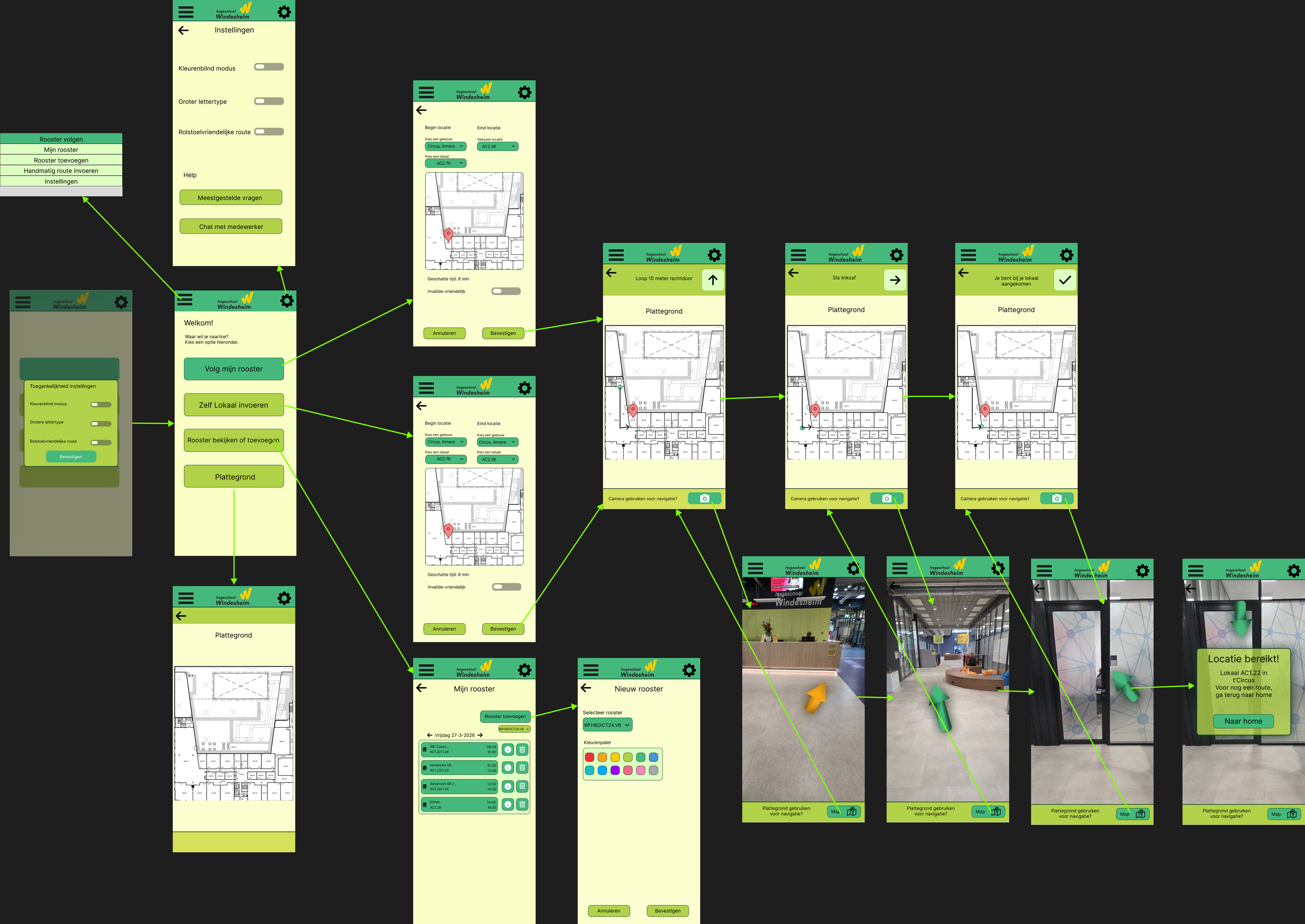 De app werkt volledig op locatie bij Windesheim Almere. Studenten navigeren via AR pijlen van de ingang naar AC1.70 of AC1.30, met automatisch doorlopen op basis van staptelling en kompasrichting.