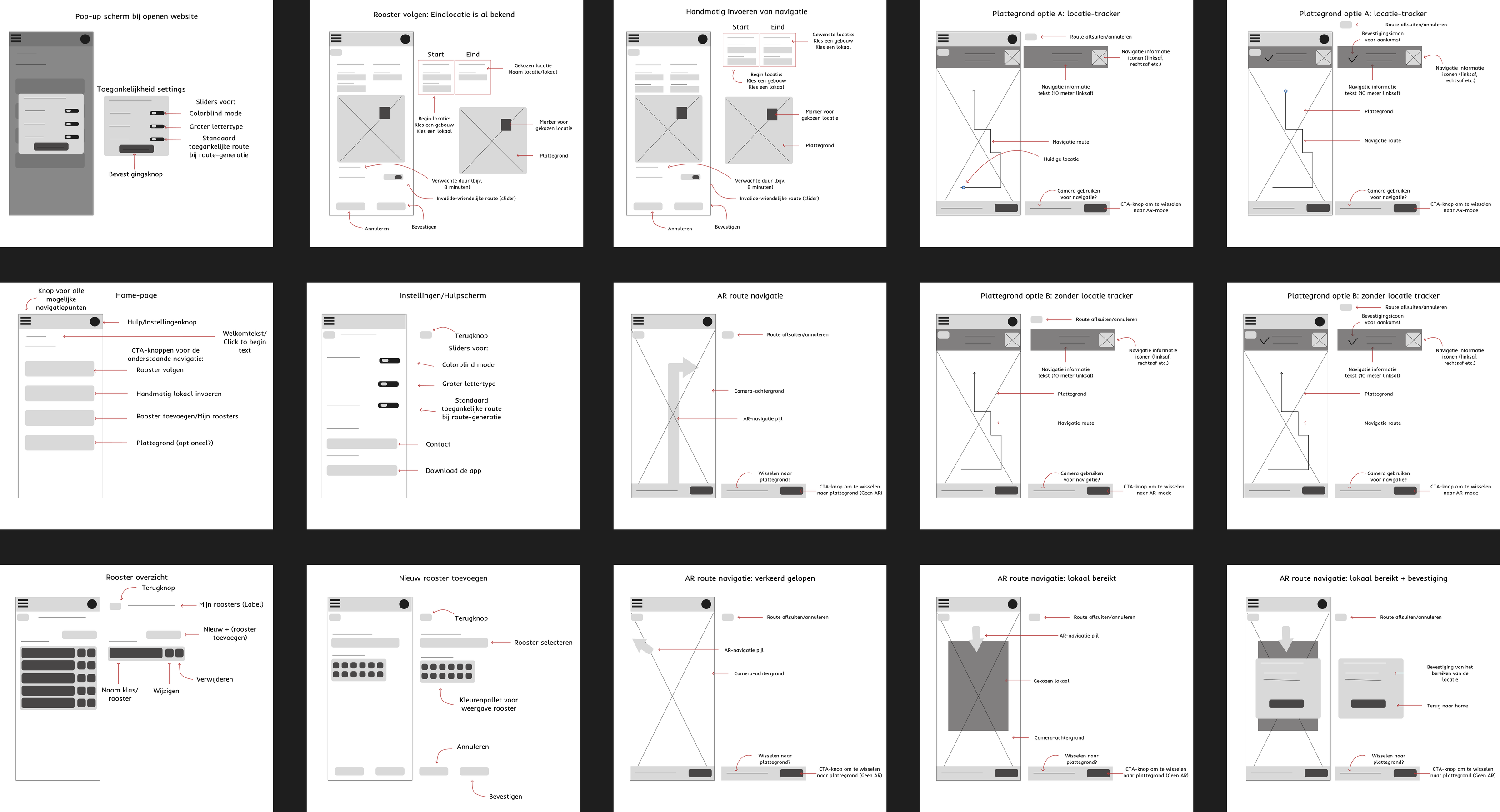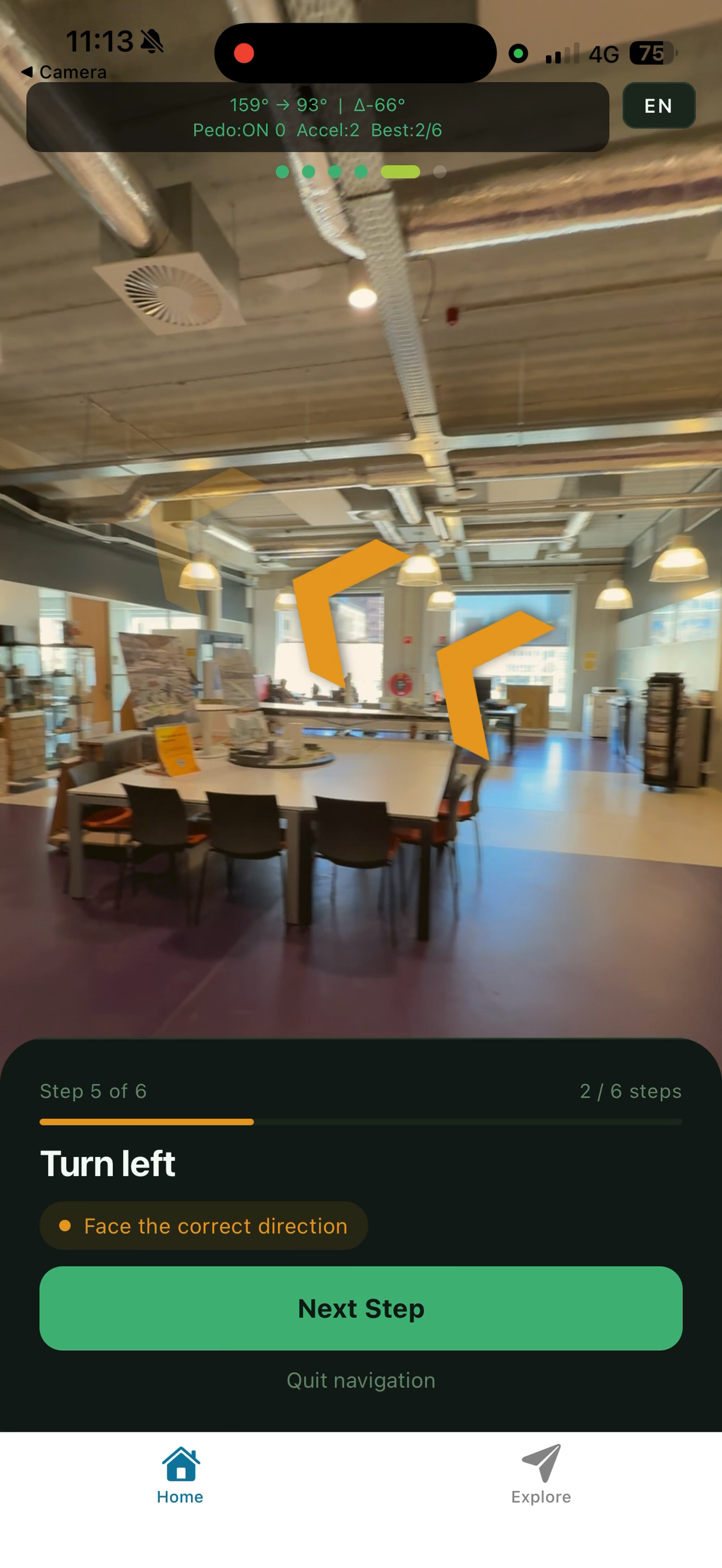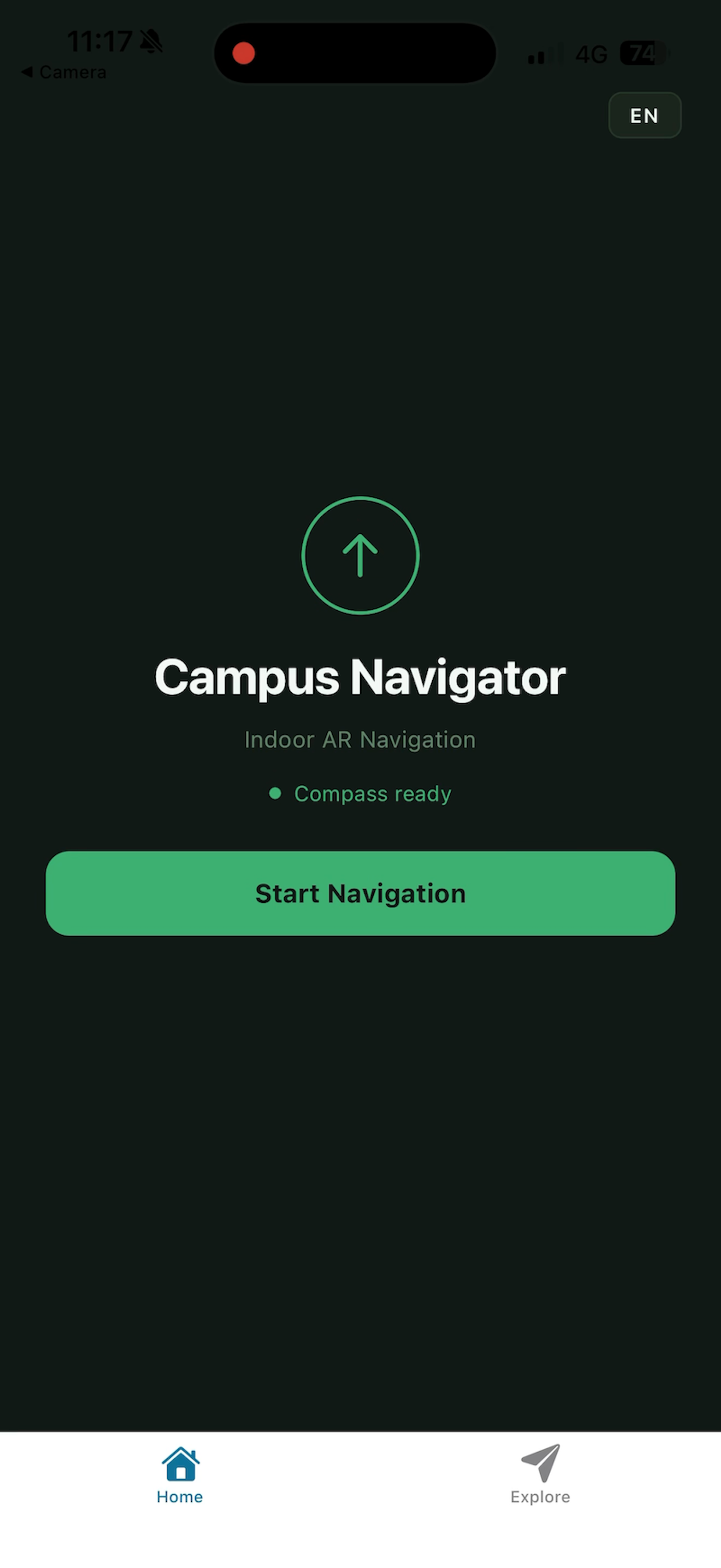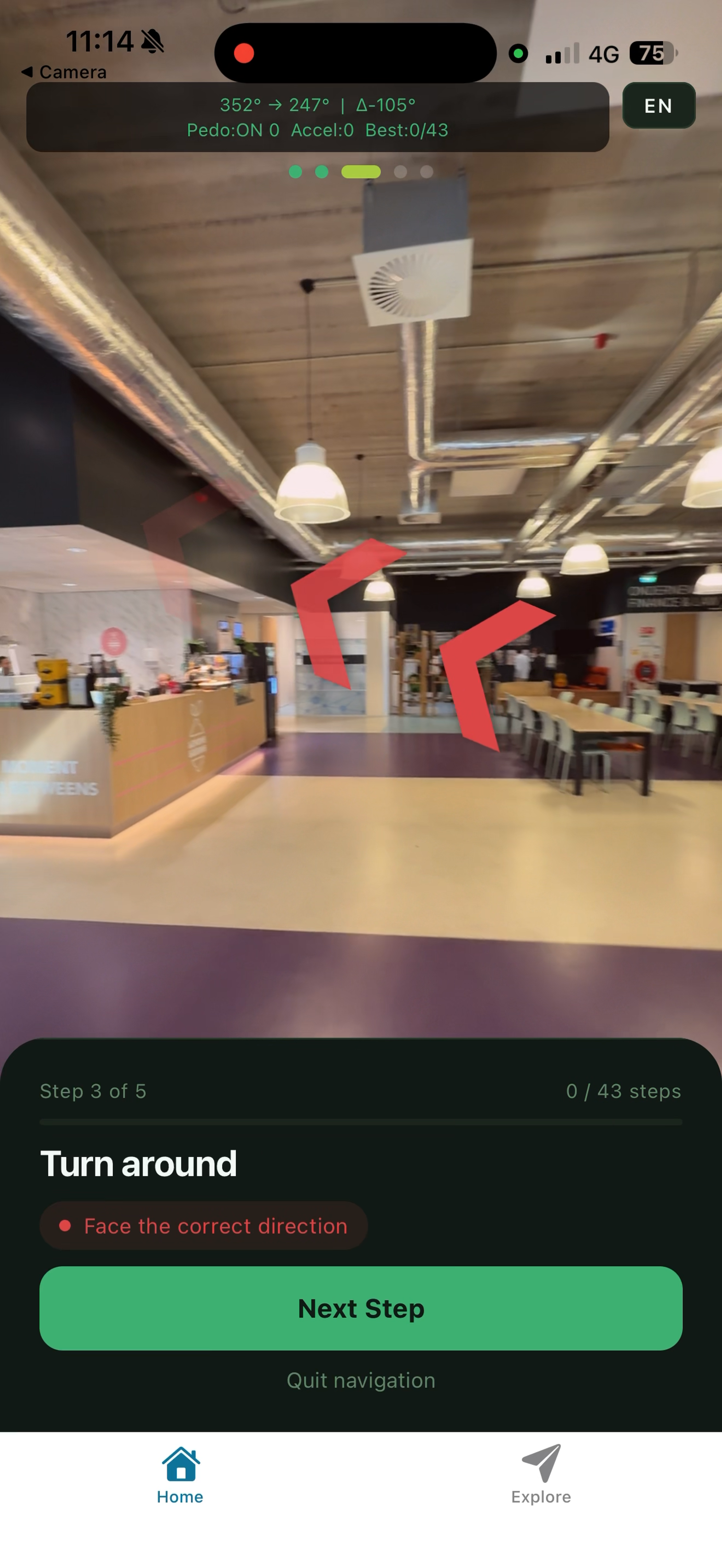De app werkt volledig op locatie bij Windesheim Almere. Studenten navigeren via AR pijlen van de ingang naar AC1.70 of AC1.30, met automatisch doorlopen op basis van staptelling en kompasrichting.