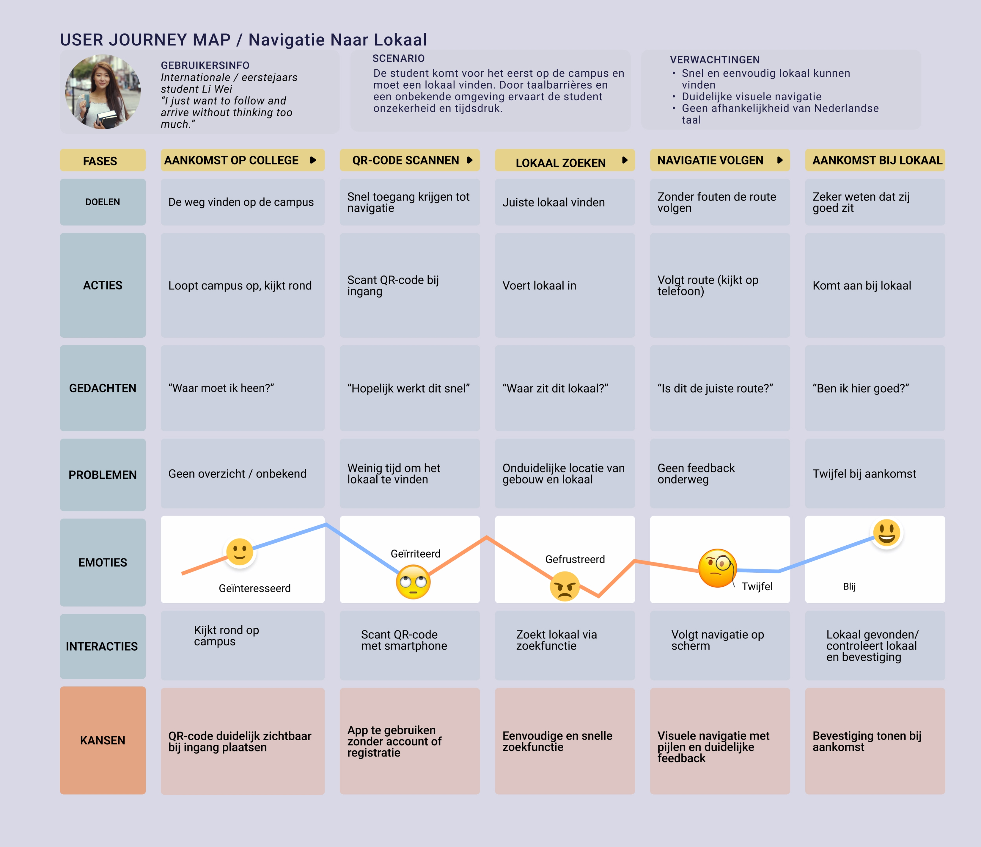 De student doorloopt vijf fases: aankomst op campus, QR-code scannen bij ingang, lokaal selecteren, AR navigatie volgen, aankomst bij lokaal.
