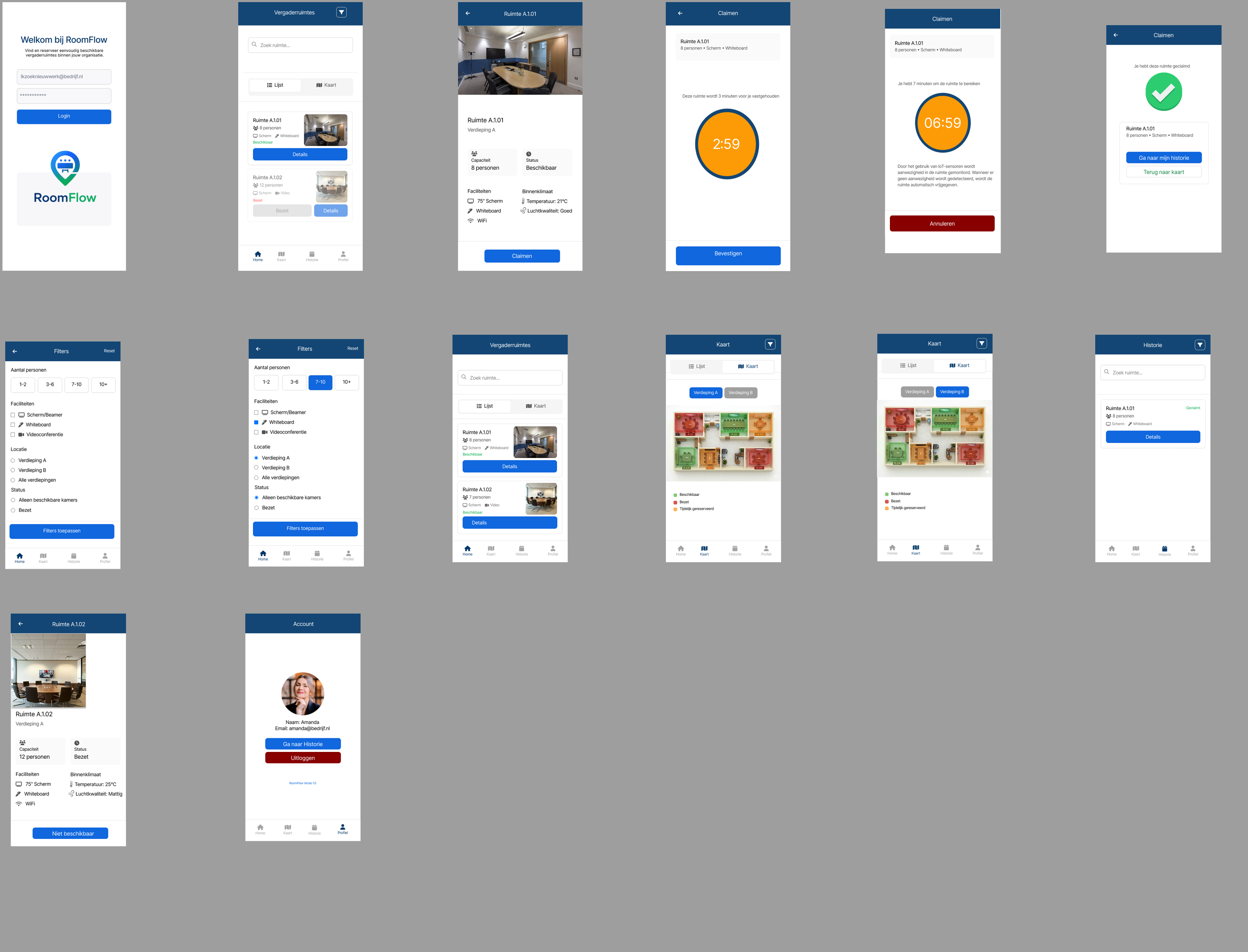 Een interactief high-fidelity prototype voor een mobiele app waarmee medewerkers real-time vergaderruimtes kunnen claimen via IoT-sensordata. Ontworpen in Figma van schets tot klikbaar prototype.