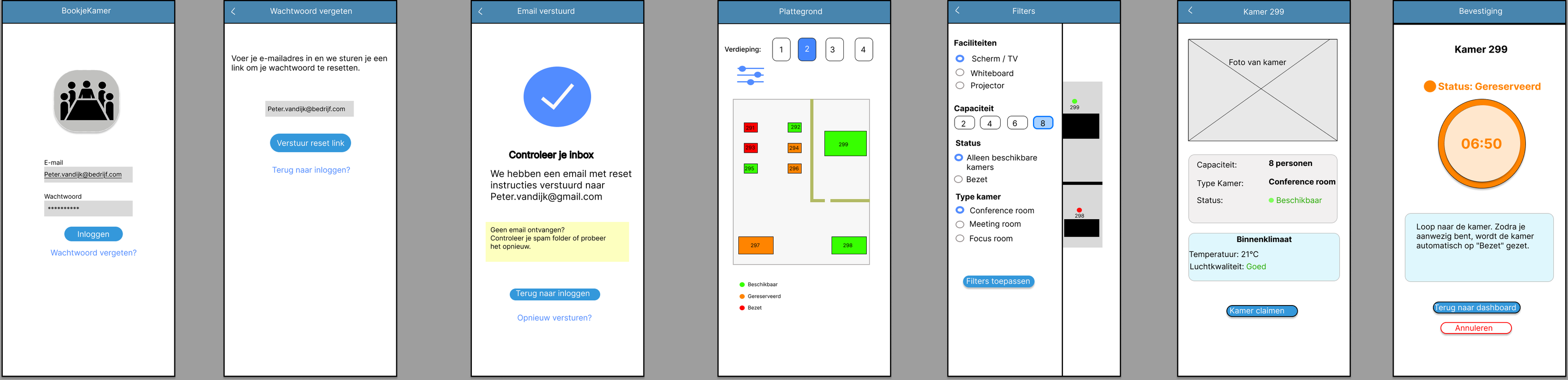 Hier is een low-fidelity wireframe van de app. Deze laat zien hoe de structuur en user flow van de applicatie is opgebouwd. Het doel is om het eenvoudig te maken voor gebruikers om snel een beschikbare vergaderruimte te vinden en tijdelijk te reserveren.