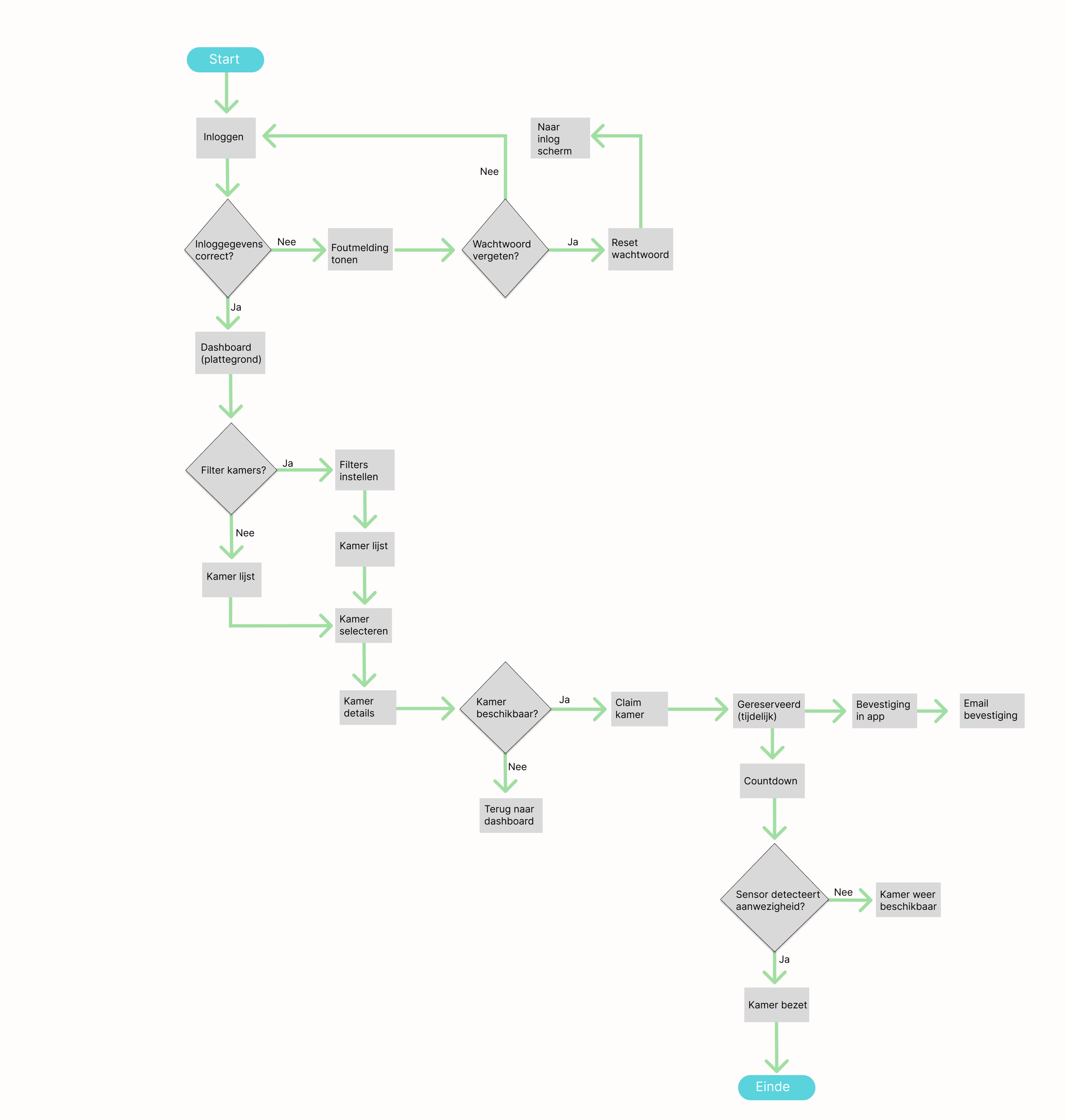 Hier is de user flow van de app. Deze laat zien hoe gebruikers door de app navigeren, van het inloggen tot het vinden en tijdelijk reserveren van een vergaderruimte.
